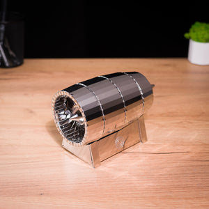 The AIR FORCE JET TURBINE is made from sustainable food-grade stainless steel approved for consumer goods and toys. The laser-cut metal parts ensure precise fitting, durability, and a premium matte metallic finish that looks impressive on display.